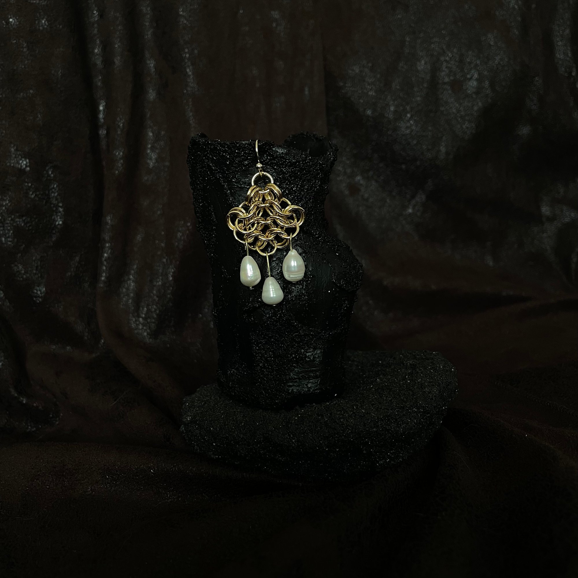 Delicately handwoven using traditional chainmail techniques, the Armatura Earrings combine structure and softness. Each piece features a cluster of interlinked rings made of 14k gold-plated rings, paired with three freshwater pearls.