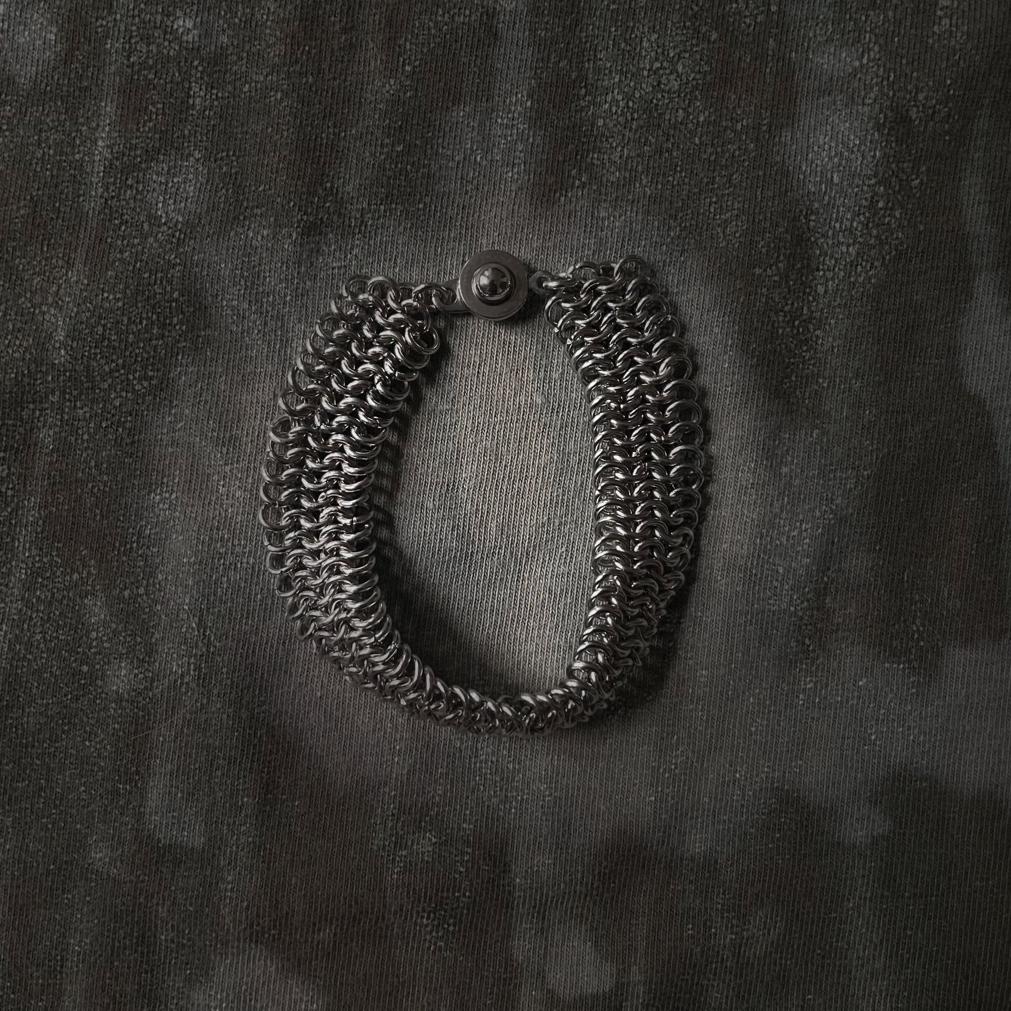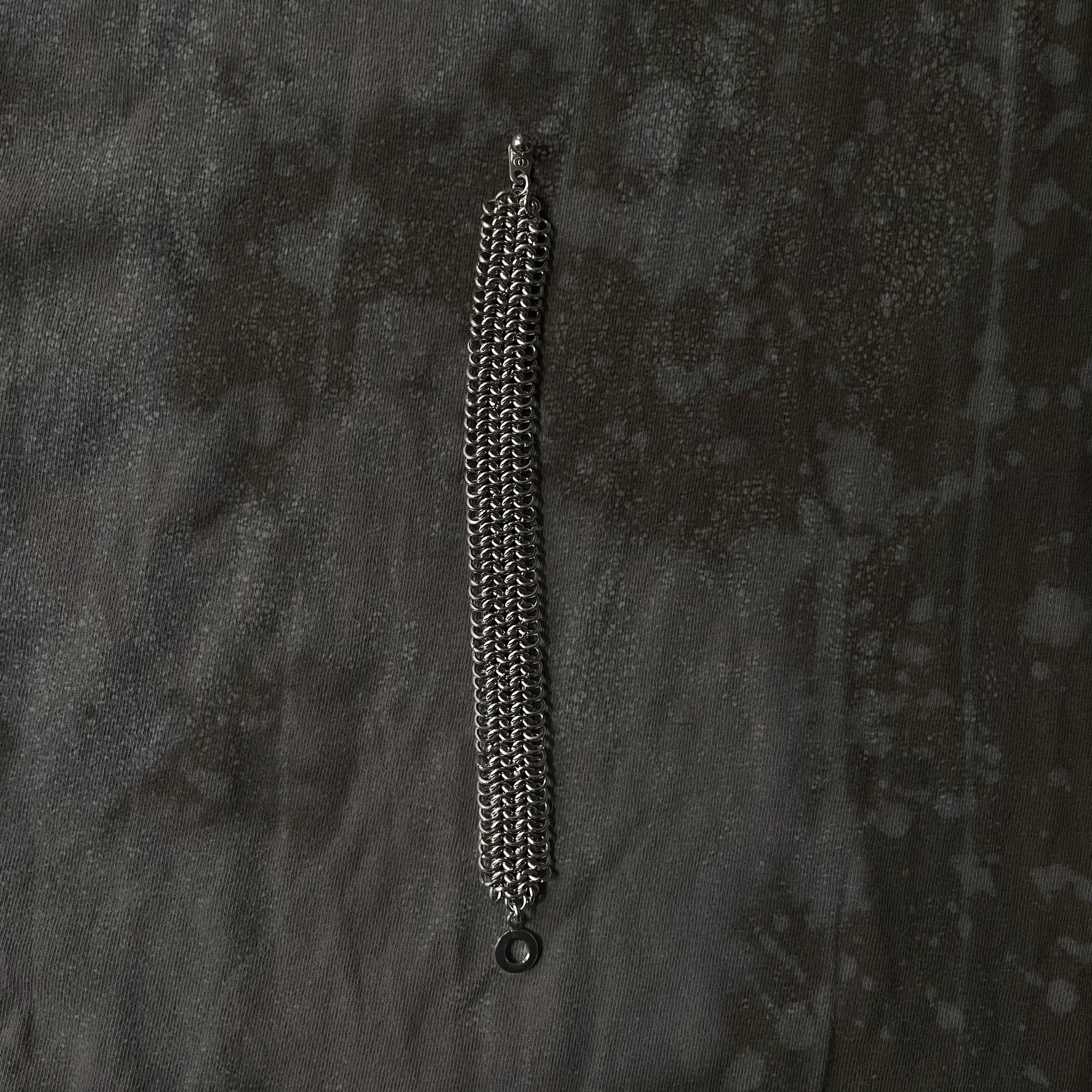 Messa Catena Cuff Bracelet. A structured, minimal bracelet handwoven in stainless steel micro-mailles. This piece wraps the wrist with quiet strength and features finished metal snaps.