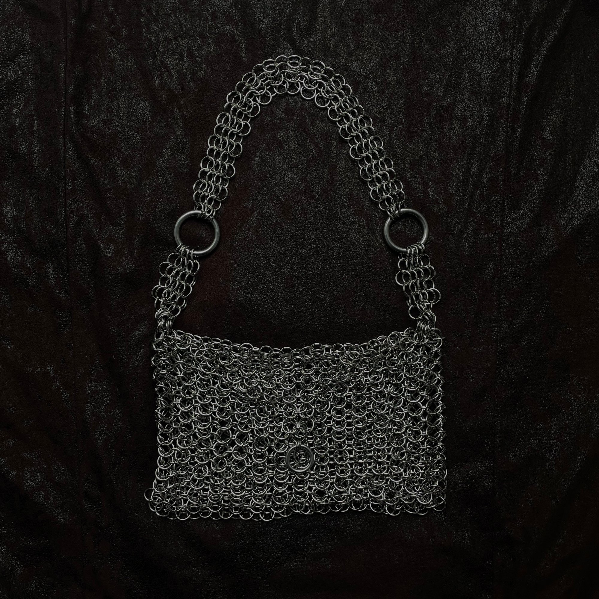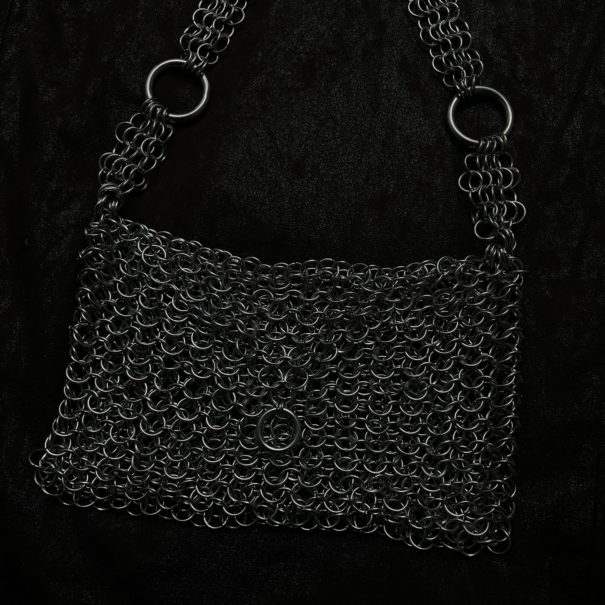 Handcrafted entirely from interlinked rings, made of stainless steel. One side of the piece is extended into a triangular flap that folds over the opening, adding structure while helping to secure the contents of the bag.