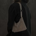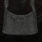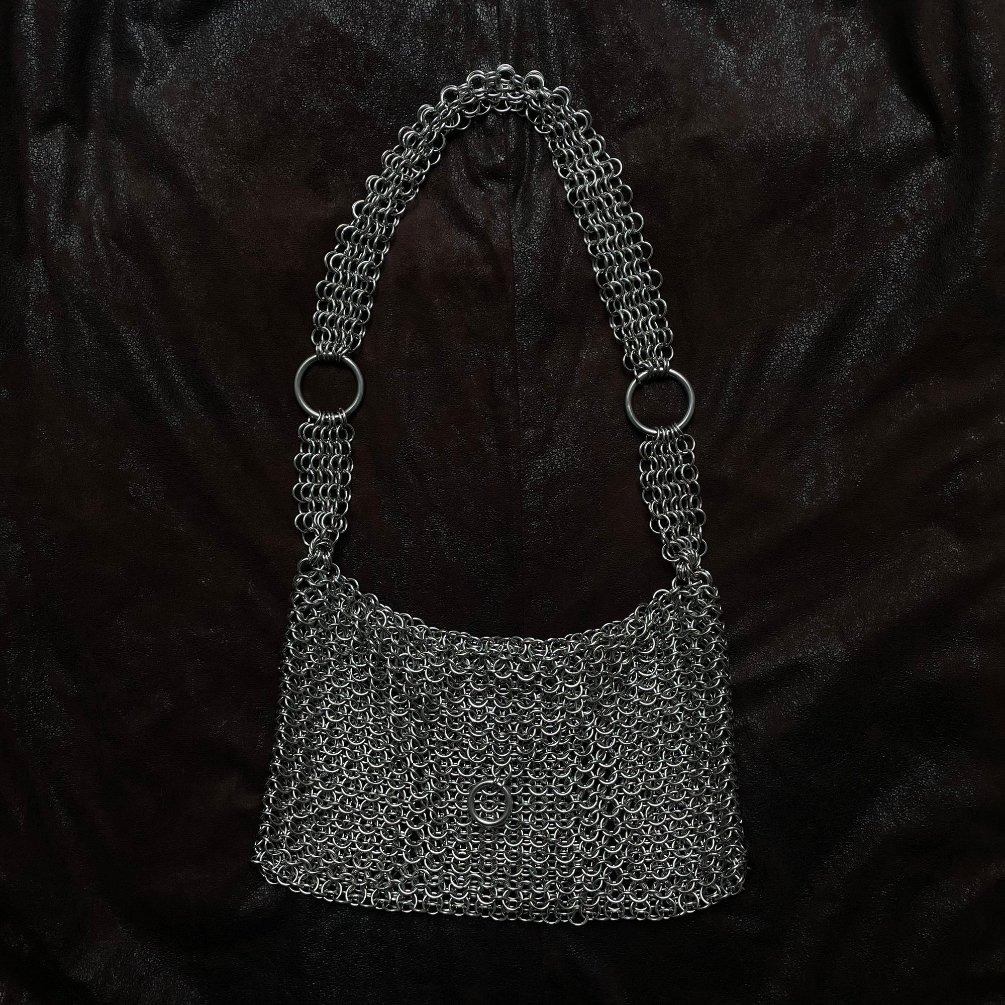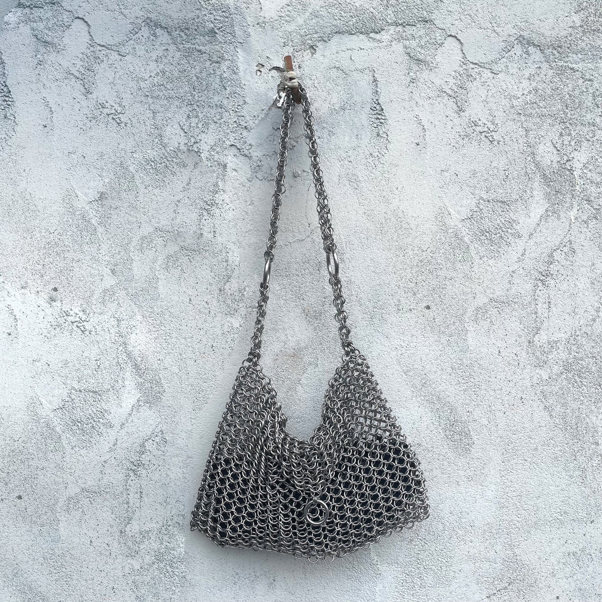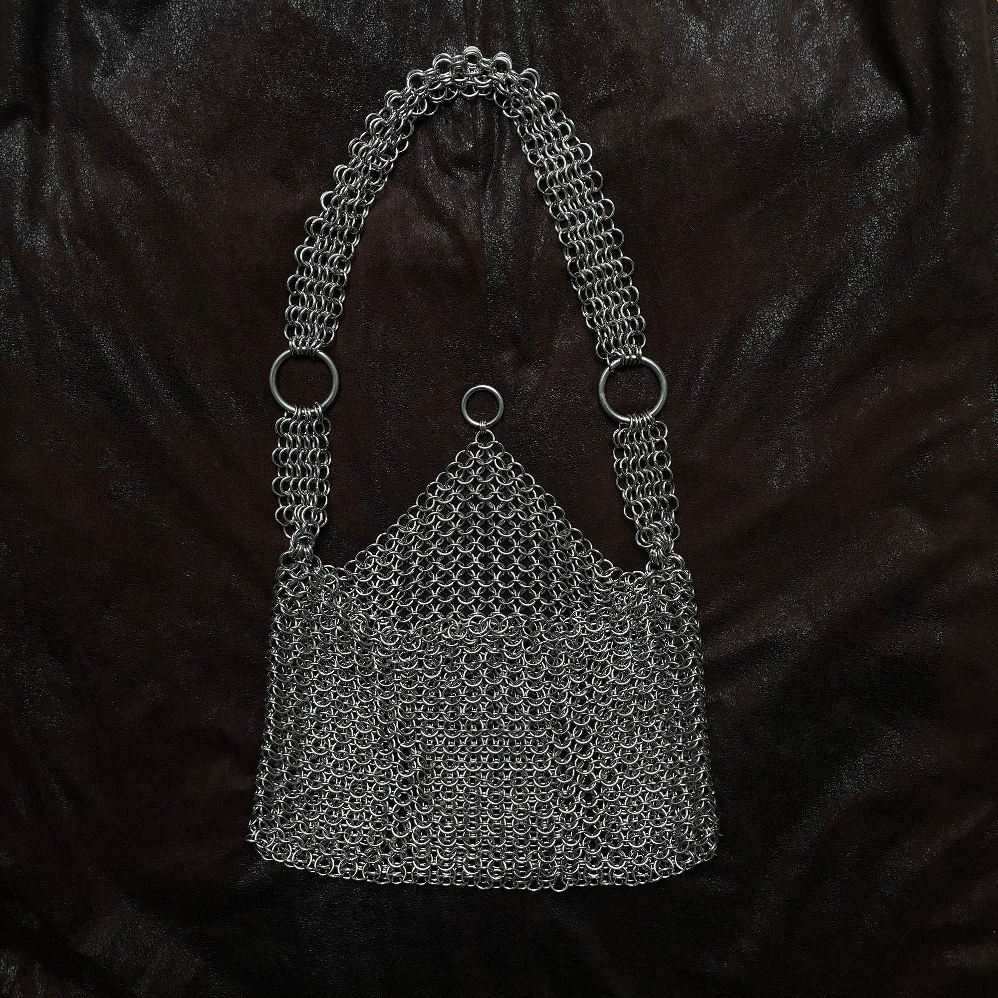 Handcrafted entirely from interlinked rings, made of stainless steel. One side of the piece is extended into a triangular flap that folds over the opening, adding structure while helping to secure the contents of the bag.