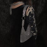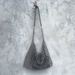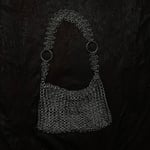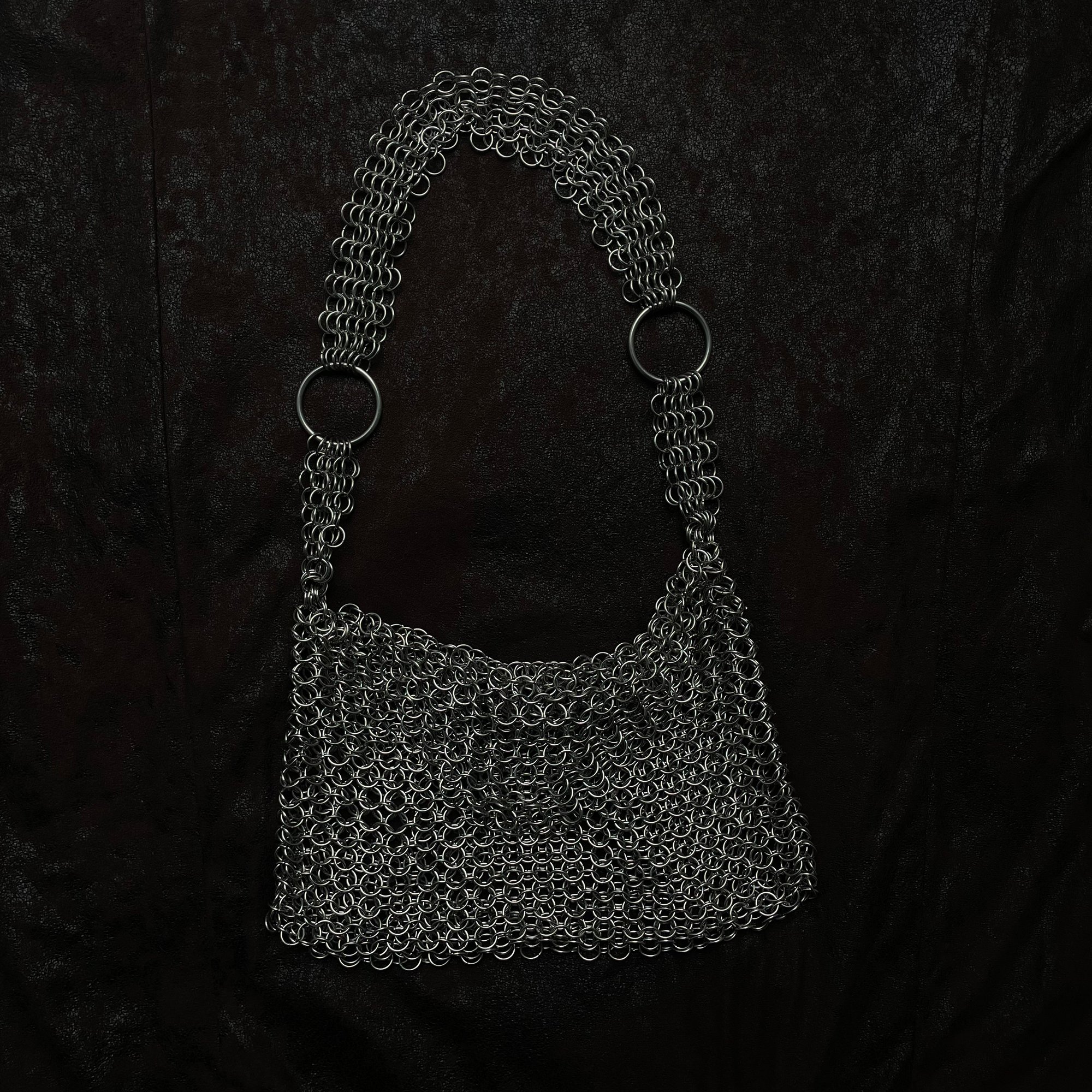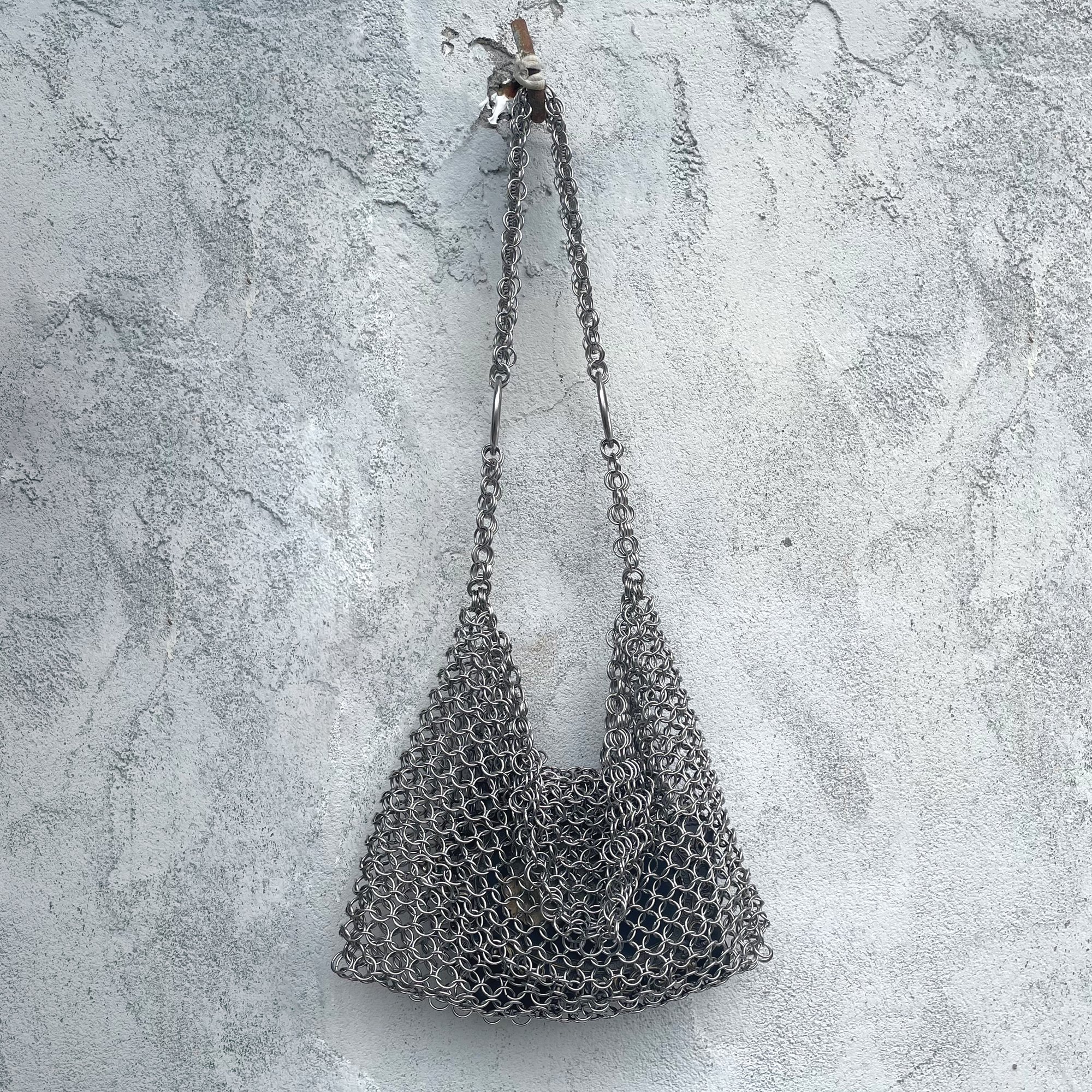 Handcrafted entirely from interlinked rings, made of stainless steel. One side of the piece is extended into a triangular flap that folds over the opening, adding structure while helping to secure the contents of the bag.