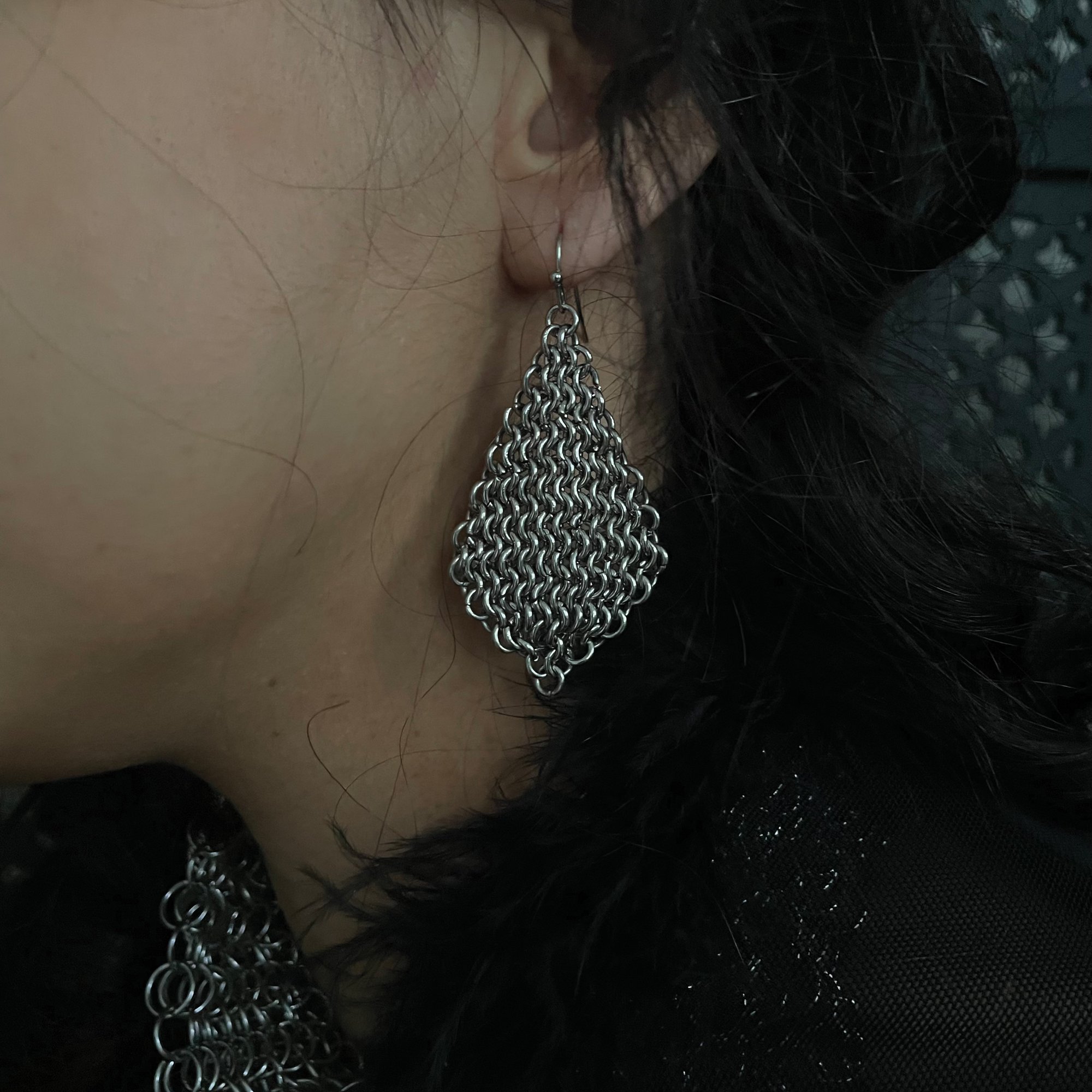 Delicately handwoven using traditional chainmail techniques, the Mesh Drop Earrings combine structure and softness. Each piece features a cluster of interlinked rings made of stainless steel.