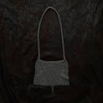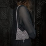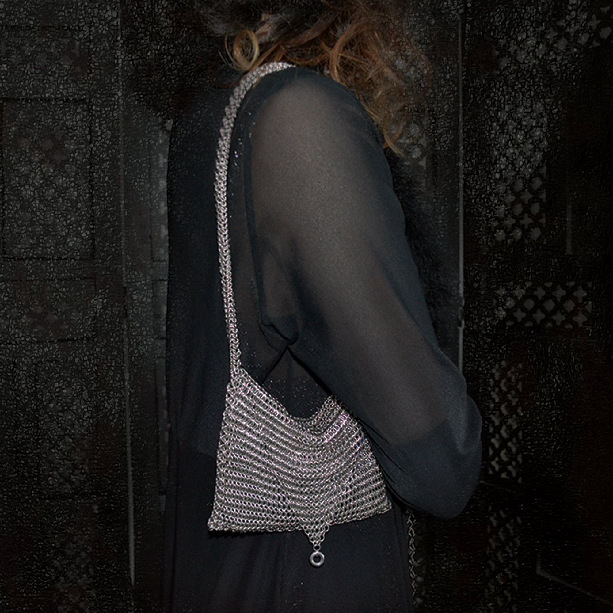 Unique piece entirely handcrafted from interlocking rings, featuring a bold decorative ring accent on the front. Over 20 hours of work in each piece.