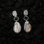 Handcrafted earrings featuring unique pearls, each with its own natural texture. The organic surface gives every pair a one-of-a-kind character, capturing light and movement beautifully. Cast in brass or silver, with silver posts.